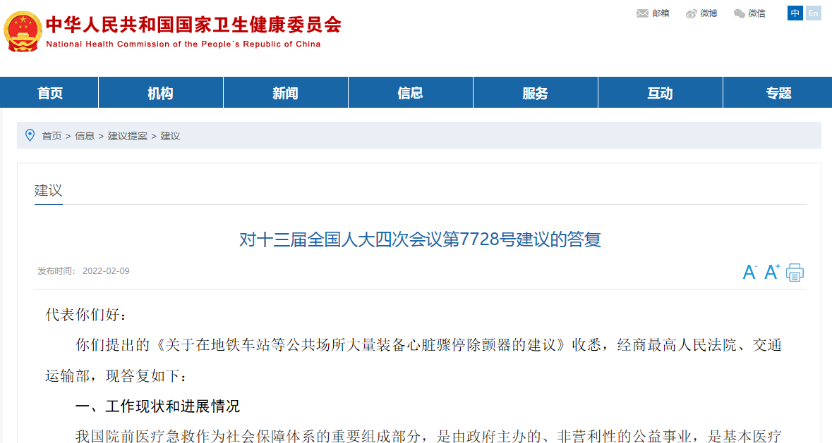 代表你們好:你們提出的《關于在地鐵車站等公共場所大量裝備心臟驟停除顫器的建議》收悉,經商最高人民法院、交通運輸部,現答復如下:一、工作現狀和進展情況我國院前醫療急救作為社會保障體系的重要組成部分,是由...